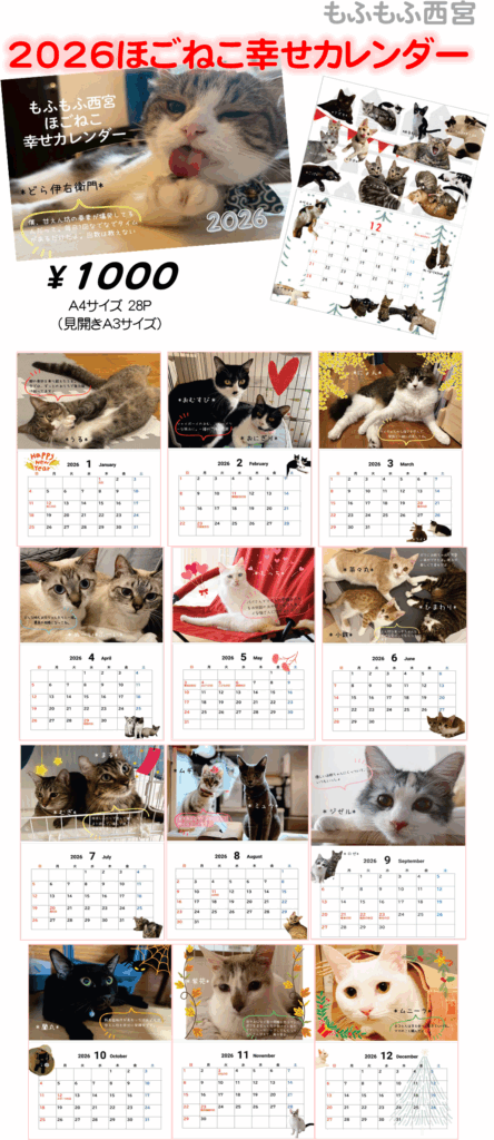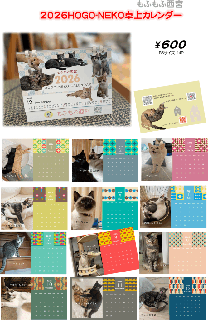 もふもふ西宮ほごねこ幸せカレンダー2026【壁掛け】1000円と【卓上】600円。